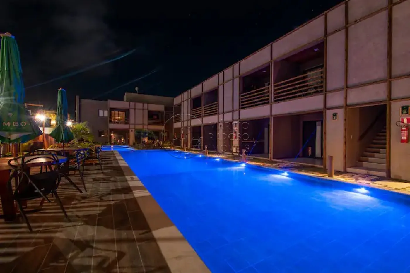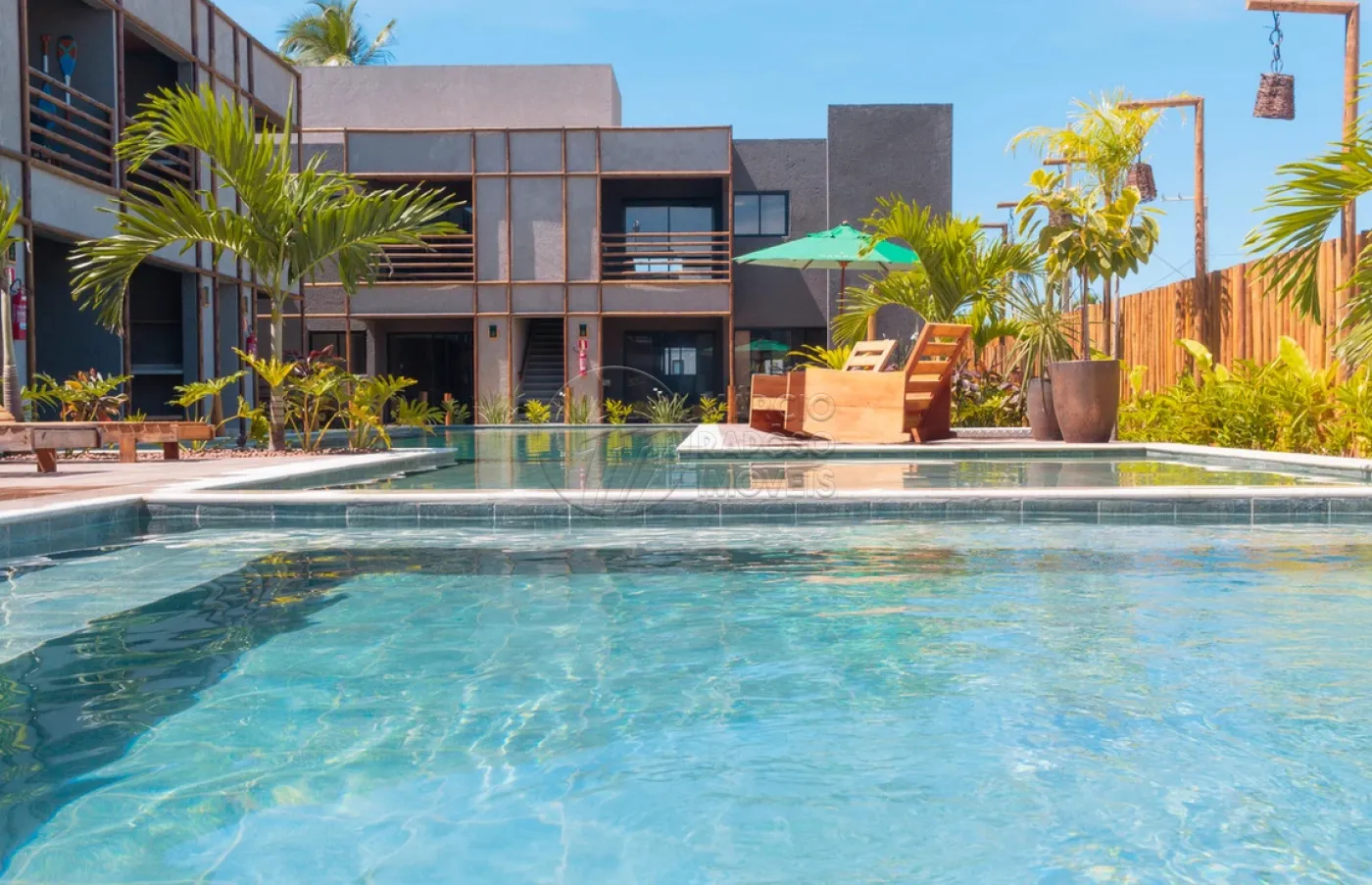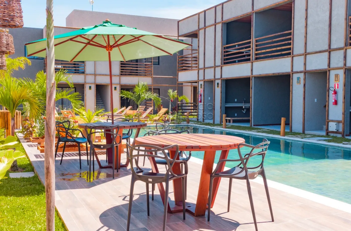 Relaxe na piscina, com chuveiro e áreas de descanso equipadas com redes e guarda-sóis.