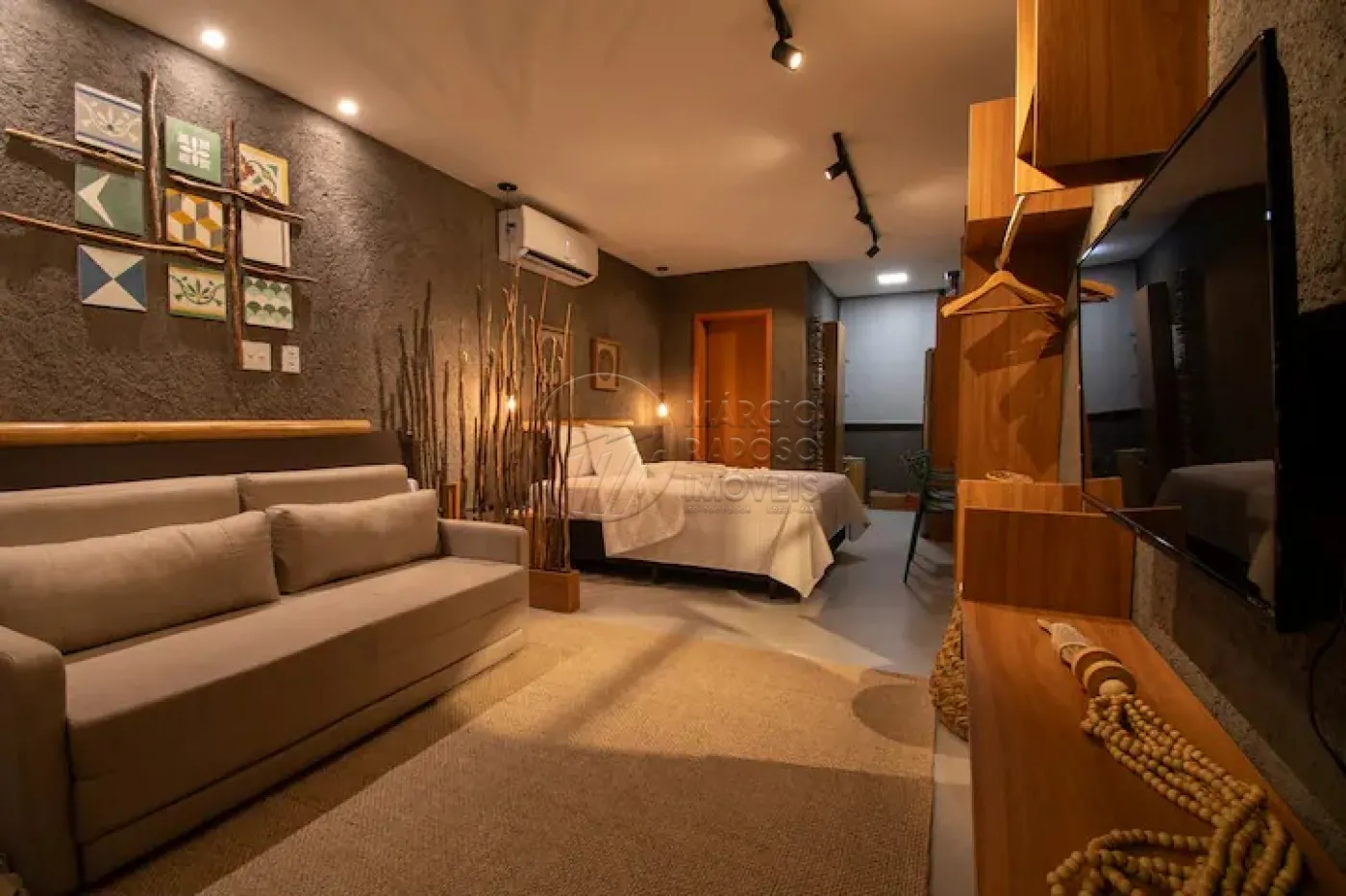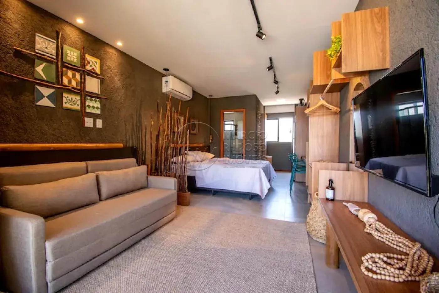 A sala de estar é perfeita para relaxar, com um sofá aconchegante, TV e rack para seus momentos de lazer.