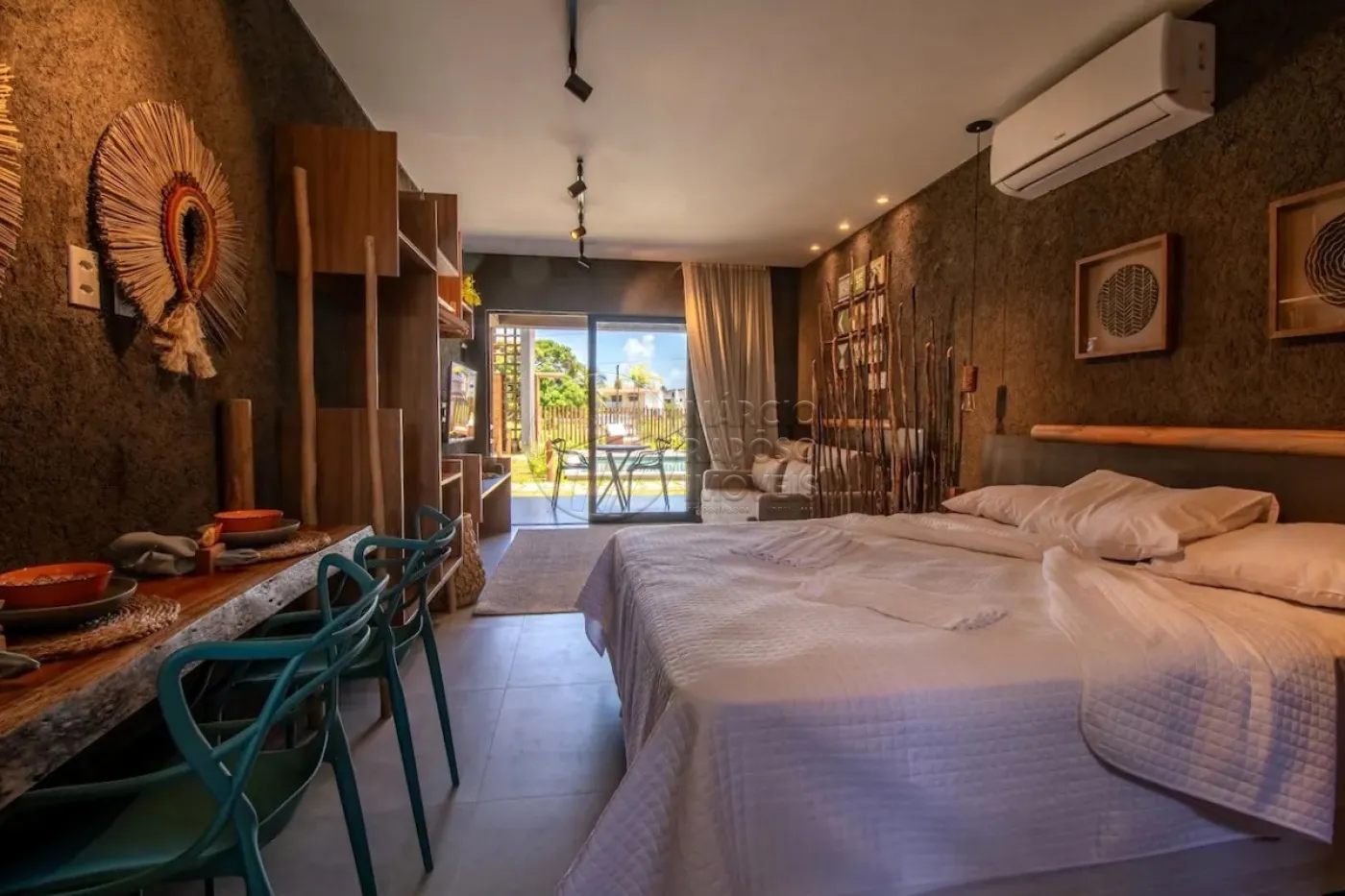 Desfrute de um quarto completo com armário espaçoso, cama confortável e ar-condicionado para noites tranquilas.
