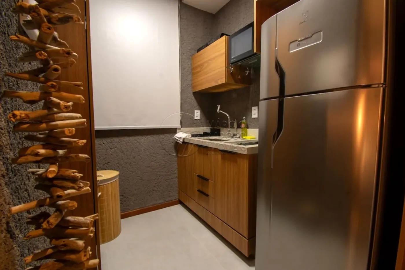 A cozinha, equipada com geladeira, micro-ondas e armários, te permite preparar suas refeições com praticidade.