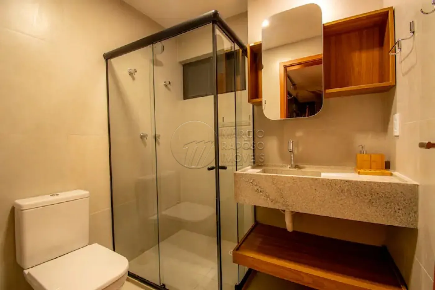 O banheiro, com box e armários, oferece todo o conforto necessário.